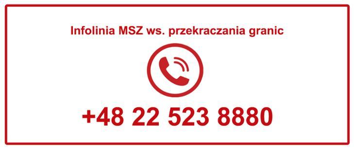 W związku z rozwojem sytuacji epidemiologicznej MSZ RP uruchomiło infolinię dot. możliwości przekraczania granic. Informacje można uzyskać pod numerem telefonu +48 22 523 8880.