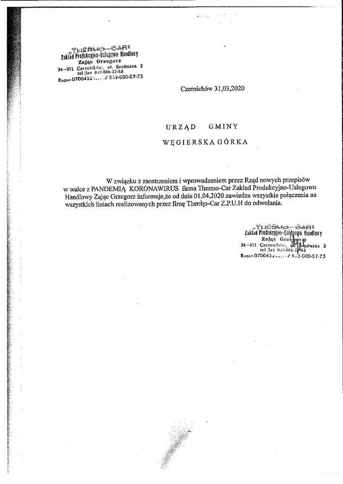 THERMO-CAR zawiesza wszystkie połączenia Opublikowano środa, 01 04 2020 Utworzono: środa, 01 04 2020 Wójt Gminy Piotr Tyrlik informuje, że firma THERMO-CAR w związku z zaostrzeniem i wprowadzeniem nowych przepisów w walce z pandemią koronawirusa, zawiesza wszystkie połączenia na wszystkich liniach aż do odwołania. Udostępnij Drukuj E-mail Poprzedni artykuł Następny artykuł