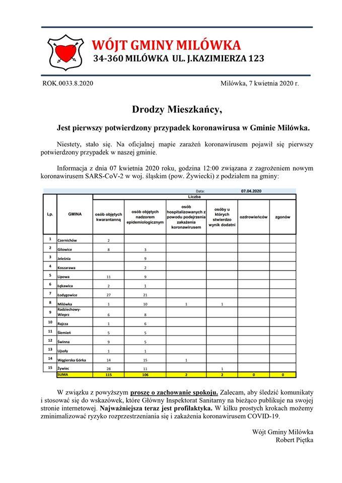 Sanepid: Potwierdzono zakażenie koronawirusem w Milówce Opublikowano wtorek, 07 04 2020 Utworzono: wtorek, 07 04 2020 Sanepid informuje o kolejnym przypadku zakażenia koronawirusem na terenie Żywiecczyzny. źródło: www.psse.zywiec.pl Udostępnij Drukuj E-mail Poprzedni artykuł Następny artykuł
