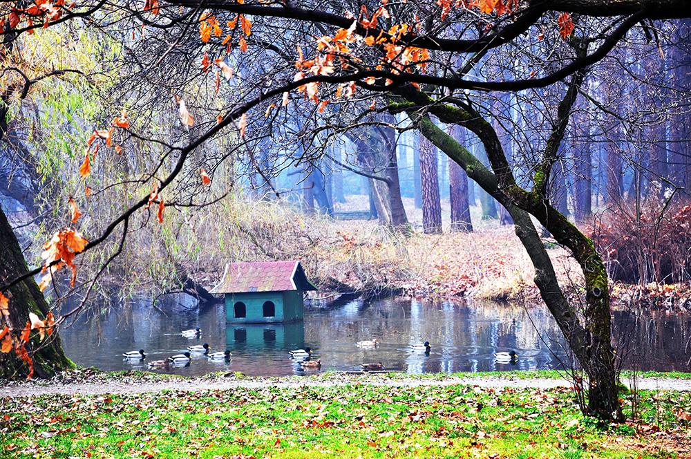 Godzina dopołudniowa w środku tygodnia, pogoda pochmurna, powietrze nie za czyste ze względu na półtoramiesięczny sezon grzewczy, mimo to w żywieckim parku spotykam biegacza, grupę cyklicznie spotykających się osób z żywieckiego klubu nordic walking - trenujących regularnie dwa razy w tygodniu po godzinie, mamy spacerują z wózkami oraz przypadkowych przechodniów. Spotykam również gołębie, kaczki i łabędzie swobodnie pływające kanałami. Po drzewach po cichu przemyka wiewiórka.