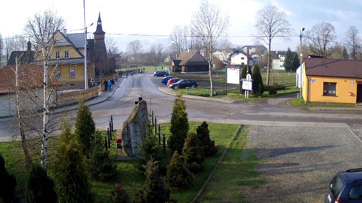 Widok na zabytkowy drewniany kościół Świętej Katarzyny Aleksandryjskiej w Cięcinie. Wybudowany w swej najstarszej części w roku 1542. Kościół znajduje się na Szlaku Architektury Drewnianej województwa śląskiego w pętli beskidzkiej.