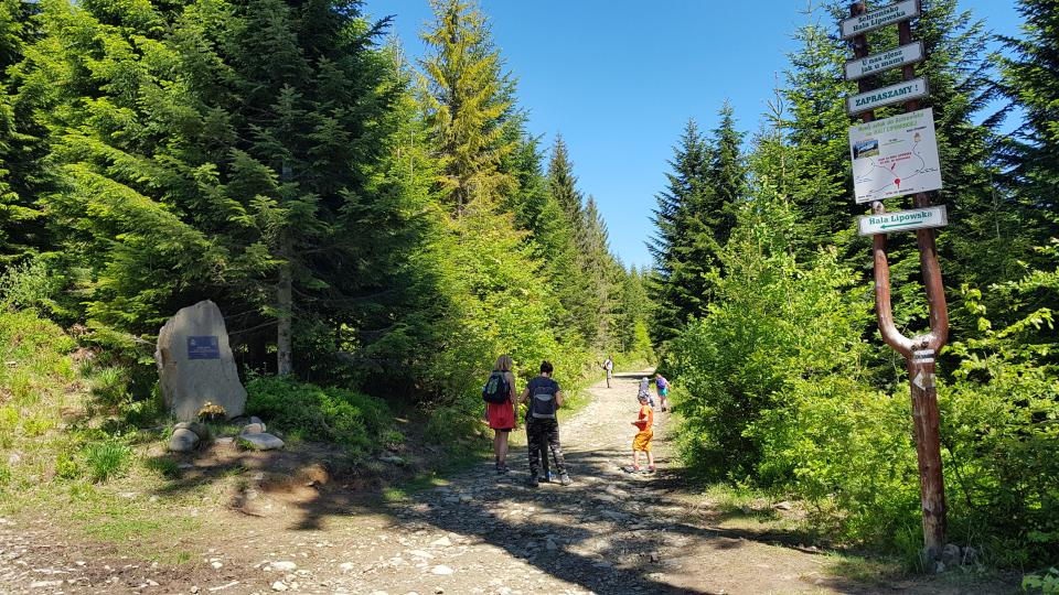 Droga pnie się powoli do góry i po około dwóch kilometrach docieramy do skrzyżowania ze szlakiem żółtym (będziemy nim schodzić), który w lewo odbija w stronę Hali Lipowskiej.