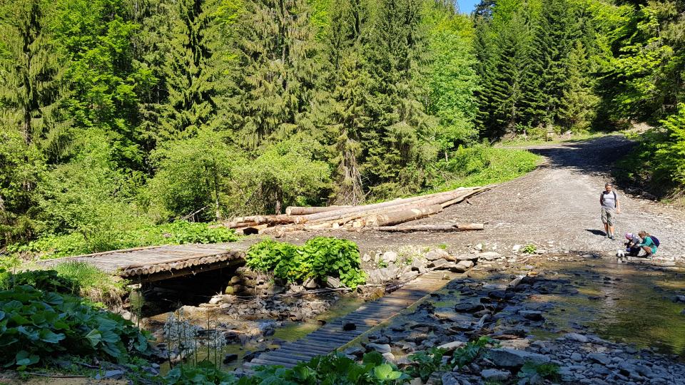 My ruszamy w górę czarnym szlakiem, drogą asfaltową wzdłuż potoku, po drodze miejsce biwakowe, by po kilkuset metrach przekroczyć drewnianym mostkiem jego koryto i ruszamy wyraźną bitą drogą dalej.