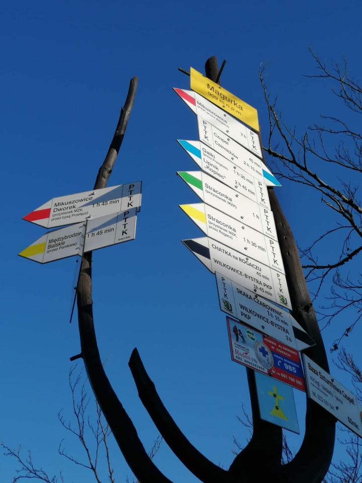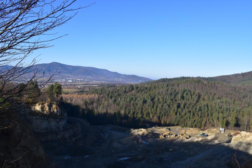 11 listopada wybrałam się z rodziną i grupą znajomych na Magurkę Wilkowicką. Wyruszyliśmy po 9.00 spod Urzędu Gminy w Łodygowicach. Dzień zapowiadał się wspaniale, piękna pogoda, słoneczko, mgiełki, niebieskie niebo, lekki mrozik. Wszyscy byli w dobrych humorach, z plecakami, część osób z kijkami, trzy psy. Grupa dzieciaków na przedzie, nie marudzą. Mają swoje tematy, żartują, wygłupiają się. Dorośli grupkami rozmawiają to o pracy, to o codziennych troskach lub o czymś na luzie. Idziemy ostro pod górę, dość długo. Pierwszym miejscem odpoczynku i atrakcyjnym punktem wycieczki jest Kamieniołom Zakładu Górniczego Łodygowice. Robi wrażenie. Stamtąd piękny widok również na góry.
